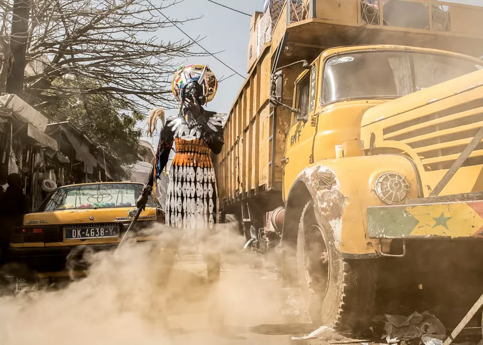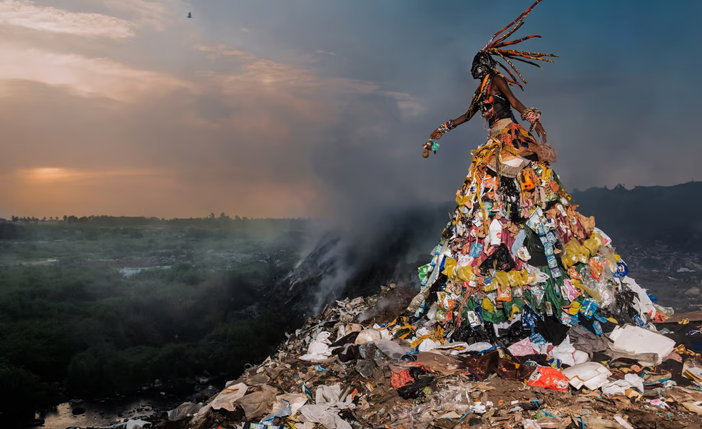 Les artistes peuvent être très créatifs pour traduire leur engagement en faveur des questions climatiques. Fabrice Monteiro en fait partie. Sa série de photographie intitulée “La Prophétie” est fascinante. Lancé en 2015 en collaboration avec Doulsy (styliste), le professeur activiste Adams Tidjani de l’université Cheikh Anta Diop de Dakar et la Communauté Ecofund (association écologiste), ce projet a pour objectif de sensibiliser le public aux fléaux écologiques majeurs qui affectent le Sénégal, et le monde. Ces images prédisent une terrible prophétie si les comportements n’évoluent pas face aux menaces écologiques. Concrètement, les photos mettent en scène un «djinn » (esprit) familier aux populations africaines pour traiter des problématiques préoccupantes allant des déchets aux inondations. Les « djinns » sont des créatures surnaturelles reconnus dans la tradition musulmane et païenne. Comme le fait remarquer Westermarck (1935, p. 19 cité par Radi, 2013, p.41): « On distingue plusieurs couches superposées dans la masse des croyances et pratiques qui règnent en pays mahométans relativement au djinn : il y a celles qui, datant du vieux paganisme arabe, en perpétuent des vestiges ; il y a celles qu’y ajouta la religion nouvelle ; d’autres enfin sont issues, dans les pays où elle se répandit, de croyances et pratiques propres à ces pays et antérieures à cette religion. ». Cette stratification symbolique confère au djinn une puissance narrative d’autant plus forte qu’elle parle directement à l’imaginaire collectif sénégalais. La créature nourrit craintes et respect.